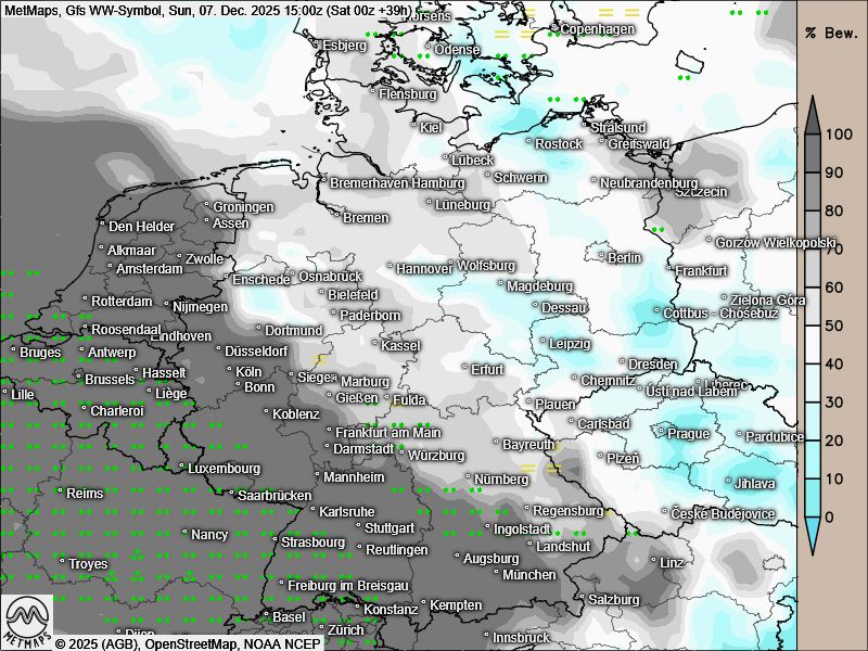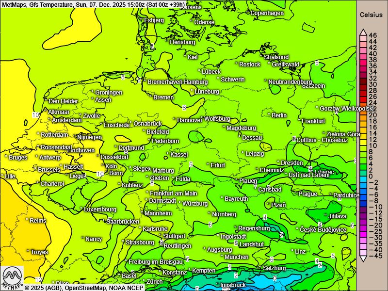 Die Temperaturkarte für den zweiten Adventsnachmittag sowie die Wetterkarten für Samstag- und Sonntagnachmittag nach GFS: