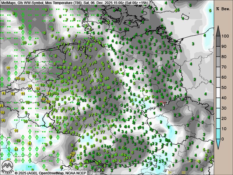 Bis zum Samstagnachmittag steigen die Temperaturen unter Regenwolken im Westen  auf Werte um 10 Grad an, im Osten bleibt es mit drei bis fünf Grad noch merklich kühler.
