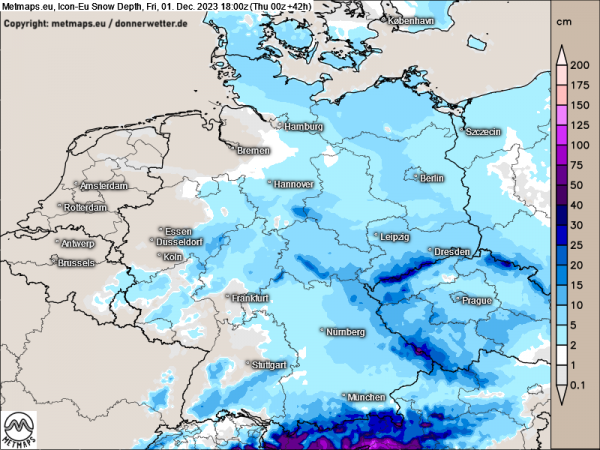 Gerade in Baden-Württemberg und Bayern schneit es sich am heutigen Donnerstag richtig ein, mehrere Zentimeter Neuschnee sind zu erwarten, zeitweise kann auch mal Schneeregen dabei sein. Besonders südlich der Donau, im Münchener Raum und am Alpenrand können es am Ende 10 bis 20 Zentimeter Neuschnee werden.
