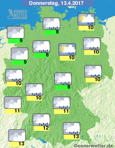 An Gründonnerstag bleibt der Himmel meist bedeckt, einzelne Aufheiterungen gibt es hier und da vor allem mal im Nordosten. Immer wieder fällt Regen, dazu Werte um kühle 8 bis 13 Grad C.
