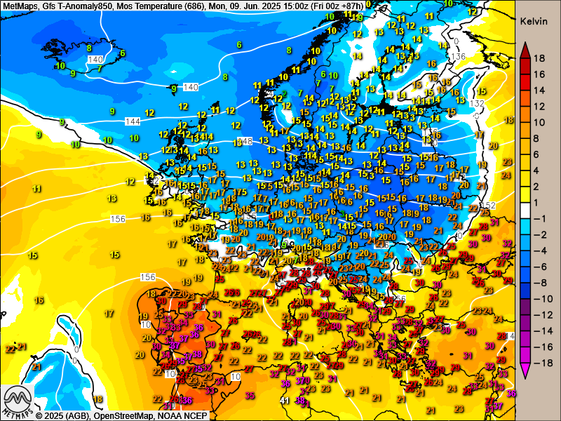 Die Karte zeigt neben den Temperaturen für Pfingsmontag (15:00 Uhr) die Temperaturanomalie - während es in Mitteleuropa zu kühl ist, liegt die Temperaturabweichung im Mittelmeerraum deutlich über dem Mittelwert.