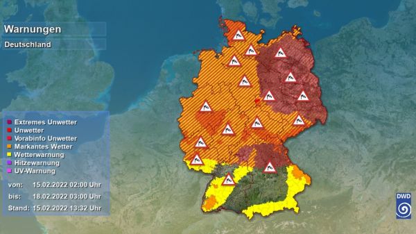 Noch ist nicht ganz klar, wie weit das Tief in den Süden der Republik reicht - sowohl positive wie auch negative Szenarien sind denkbar. Für tiefere Lagen Bayerns und Baden-Württembergs sind aus aktueller Sicht Böen von "nur" 70 km/h wahrscheinlich.