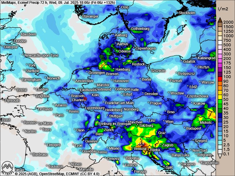 Die Karten bilden die 72-Stunden-Regenmengen nach ECMWF sowie die Entwicklung der Waldbrandgefahen in Deutschland bis in die nächste Woche ab.