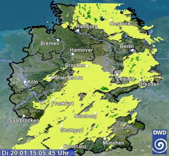 Aktuell schneit es von Baden-Württemberg, über Hessen, Bayern in die jungen östlichen Bundesländer. Auch in Berlin fällt etwas Schnee. Im Laufe der nächsten Stunden allerdings wird es etwas milder und es fällt unterhalb von 200-300 m im Flachland Schneeregen. Nachts droht das überfrierende Nässe und Reif.