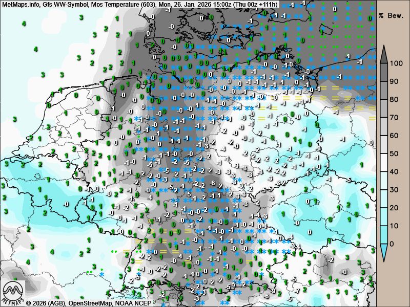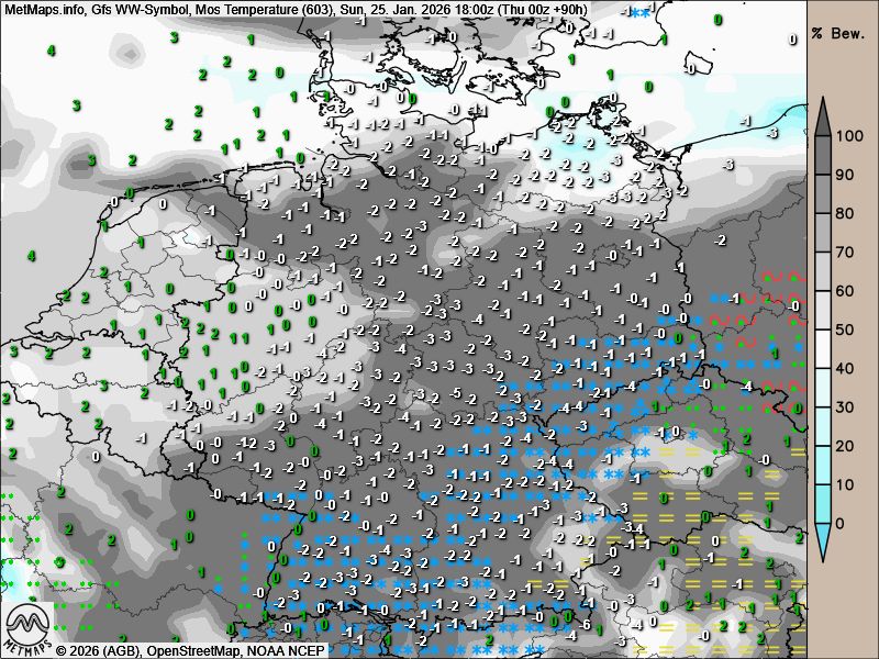Während die Wetterentwicklung für die kommende Woche noch mit großen Unsicherheiten behaftet ist, zeigt das US-Wettermodell GFS für Sonntag bis Montag eine ausgeprägte Schneelage.