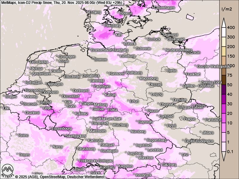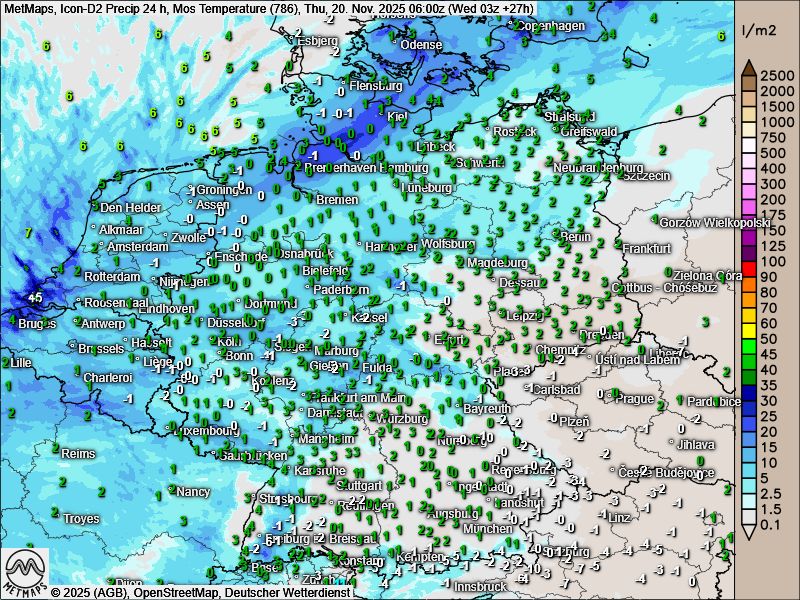 Die Schneehöhen am Mittwochabend und Donnerstagfrüh sowie die Temperaturkarte mit den 24-Stunden-Regenmengen bis Donnerstagfrüh nach Icon-DS: