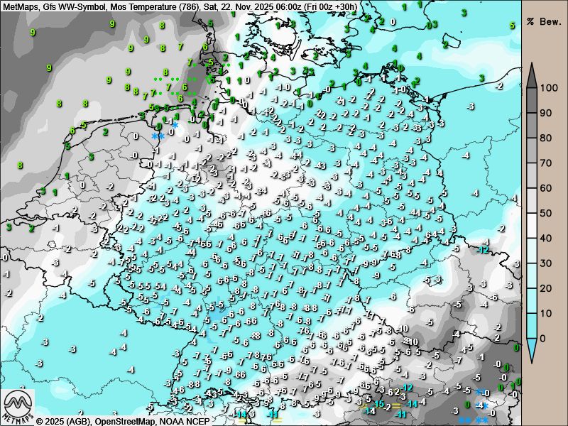 Die Wetter- / Temperaturkarte für Samstagfrüh (06:00 Uhr) sowie für Sonntagmorgen (09:00 Uhr) nach GFS: