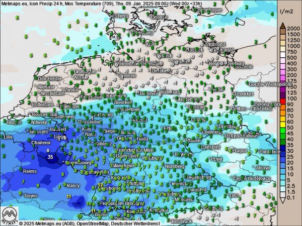 In der kommenden Nacht und Donnerstagfrüh bekommen wir es mit großen Regenmengen zu tun, die in NRW nachts zum Teil auch in Schnee übergehen. Auch Benelux und der Norden Frankreichs sind betroffen.