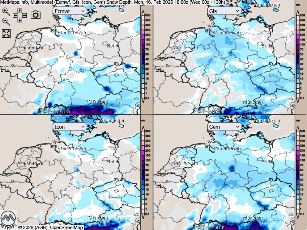 Die prognostizierten Schneehöhen für Rosenmontag in der Multi-Modellrechnung zeigt die Unsicherheiten:
