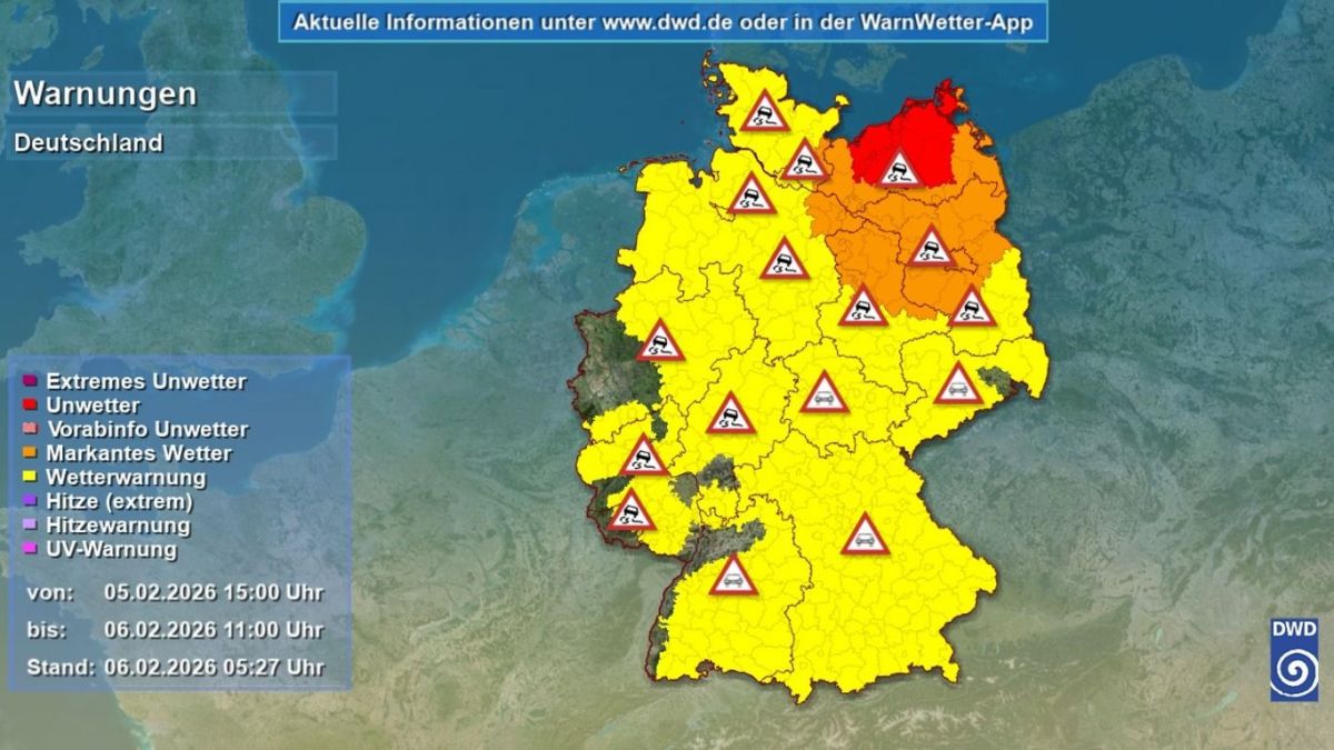 Für den Norden und Nordosten Deutschlands gilt weiterhin eine Glatteiswarnung. Besonders in den Morgen- und Vormittagsstunden besteht erhöhte Rutschgefahr auf Straßen und Wegen: