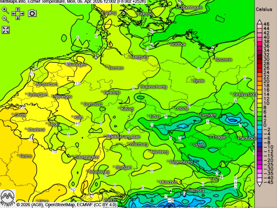 Deutlich verhaltener zeigt sich dagegen ECMWF: Das europäische Wettermodell ordnet die Höchsttemperaturen am Ostersonntag lediglich zwischen 6 und 14 Grad ein, am Ostermontag sogar nur zwischen 4 und 12 Grad. Damit bleibt es insgesamt spürbar kühler als in der GFS-Prognose. In früheren Läufen hatte das Modell für den Ostersonntag sogar zeitweise Schneesignale angedeutet.