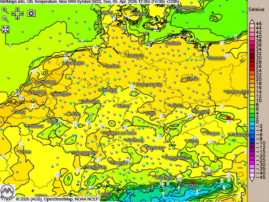 Das GFS-Modell bleibt bei der milderen Variante: Sowohl für den Ostersonntag als auch für den Ostermontag prognostiziert das Modell auf der Fläche angenehme Temperaturen. Der Ostermontag sticht dabei besonders hervor – mit Höchstwerten um 16 Grad wäre er der freundlichere und mildere der beiden Tage. Niederschlag ist nach aktuellen Berechnungen kein Thema.