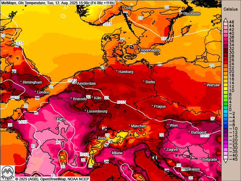 Die Temperaturkarte für den kommenden Dienstag, 15:00 Uhr, nach GFS: