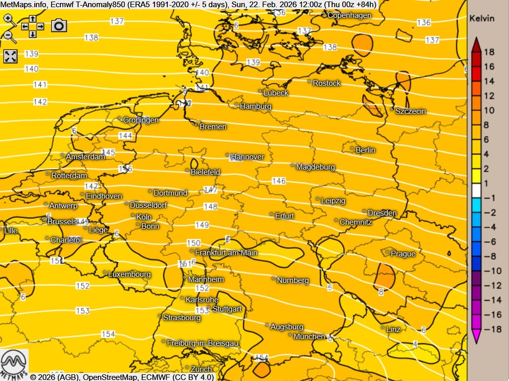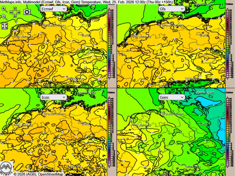Die prognostizierten Mittagswerte für den kommenden Mittwoch (Multimodellprognose) zeigen entsprechend ein deutlich milderes Temperaturniveau in weiten Teilen Deutschlands.