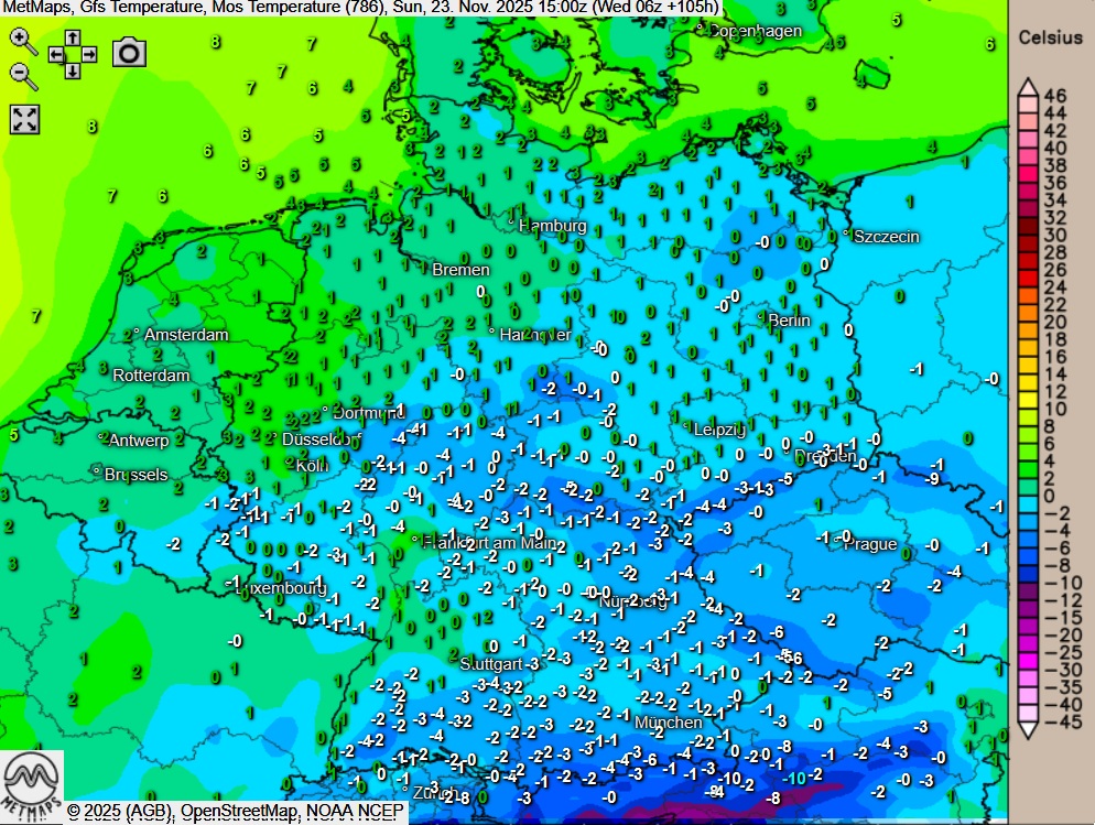 Die Lufttemperaturen am Sonntagnachmittag (15:00 Uhr) nach GFS: