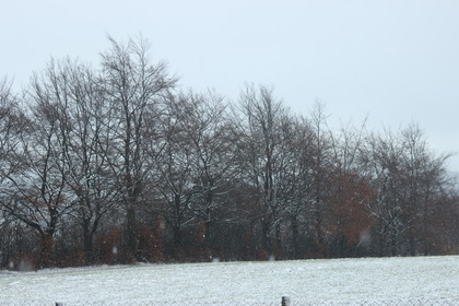 Schneefall am Donnerwetter.de Wetterpark in der Eifel auf 700 m Höhe. In vielen Mittelgebirgen hat es heute morgen etas Neuschnee gegeben. Die Temperaturen liegen um die 0 Grad C ab ca. 600 m Höhe.
